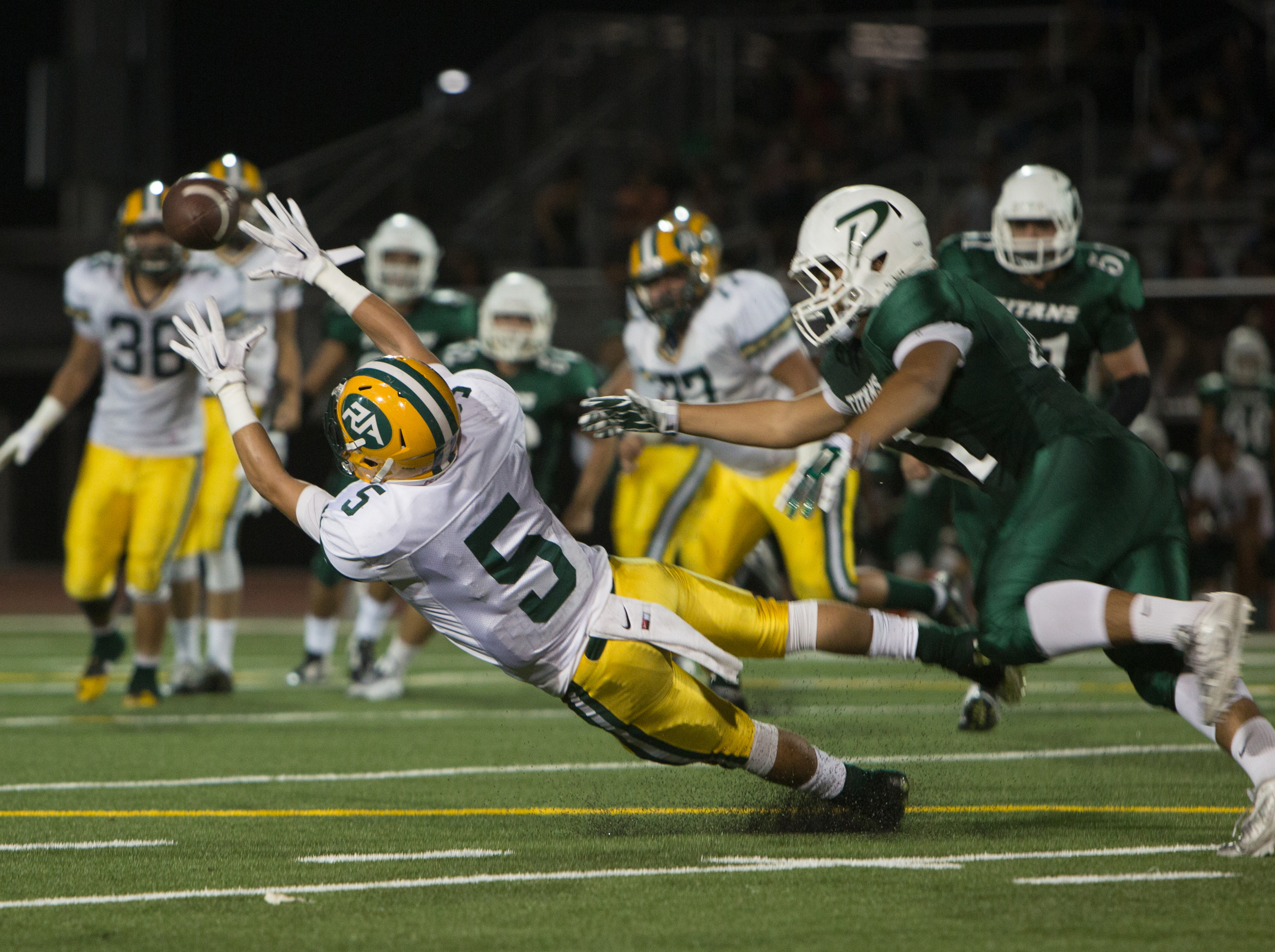 Pictured, Rancho Alamitos High's Joe Navar (5) gives it is all in trying this Blake Culbert pass against Pioneer High at Pioneer last Friday night. Pioneer won, 38-15.
